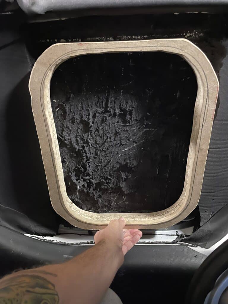5. Après avoir terminé cette étape, fixez solidement la baie à l’aide des 10 vis fournies. Cette étape doit être réalisée depuis l’intérieur du véhicule. Il est recommandé d’être à deux pour cette opération : une personne maintient la baie en place depuis l’extérieur du véhicule pendant que l’autre fixe les vis.