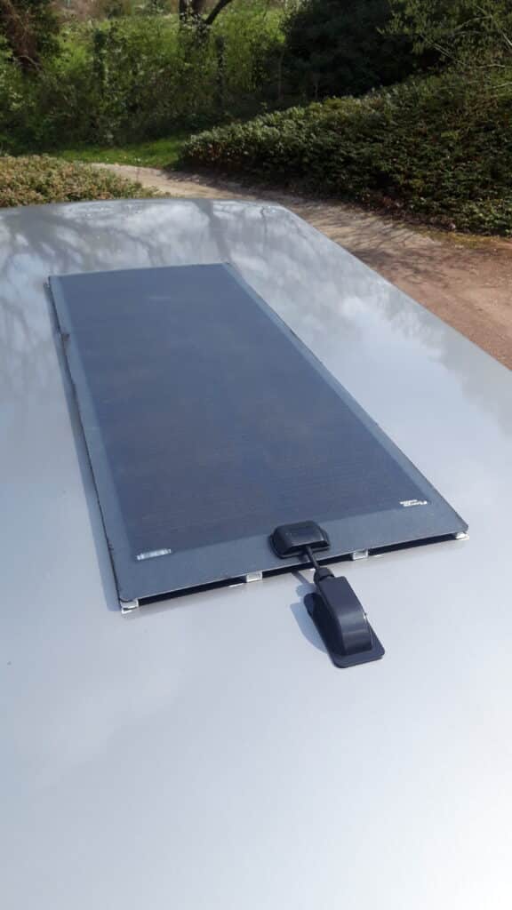 Excellent contact téléphonique pour m’indiquer comment appliquer le Sika dans les règles de l’art ( traits de colle espacés ). Mon idée a été de coller le panneau flexible sur 4 baguettes PVC l’écartant de 15mm du toit relevable de mon VW T4 . L’avenir dira si l’idée était bonne, en tous cas la ventilation est efficace .